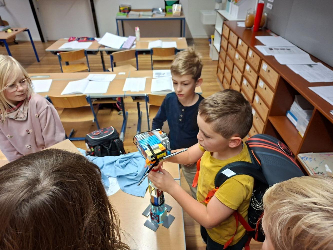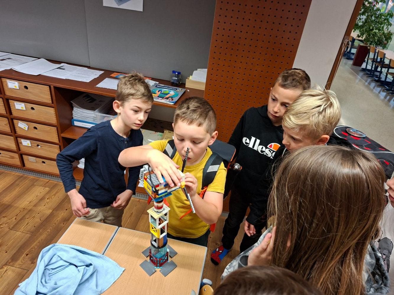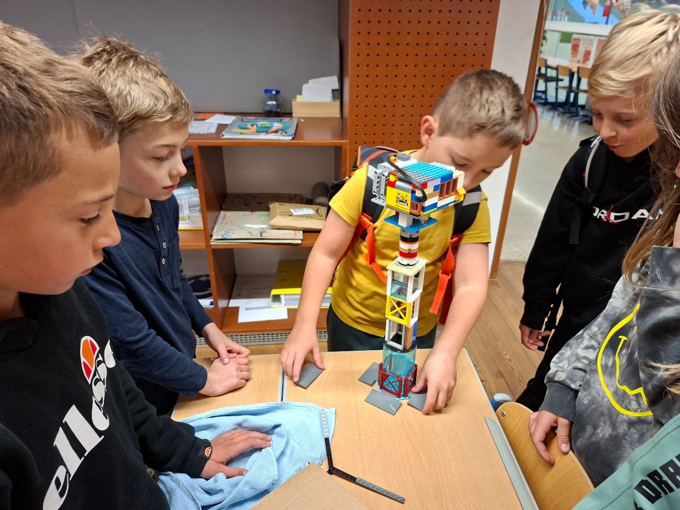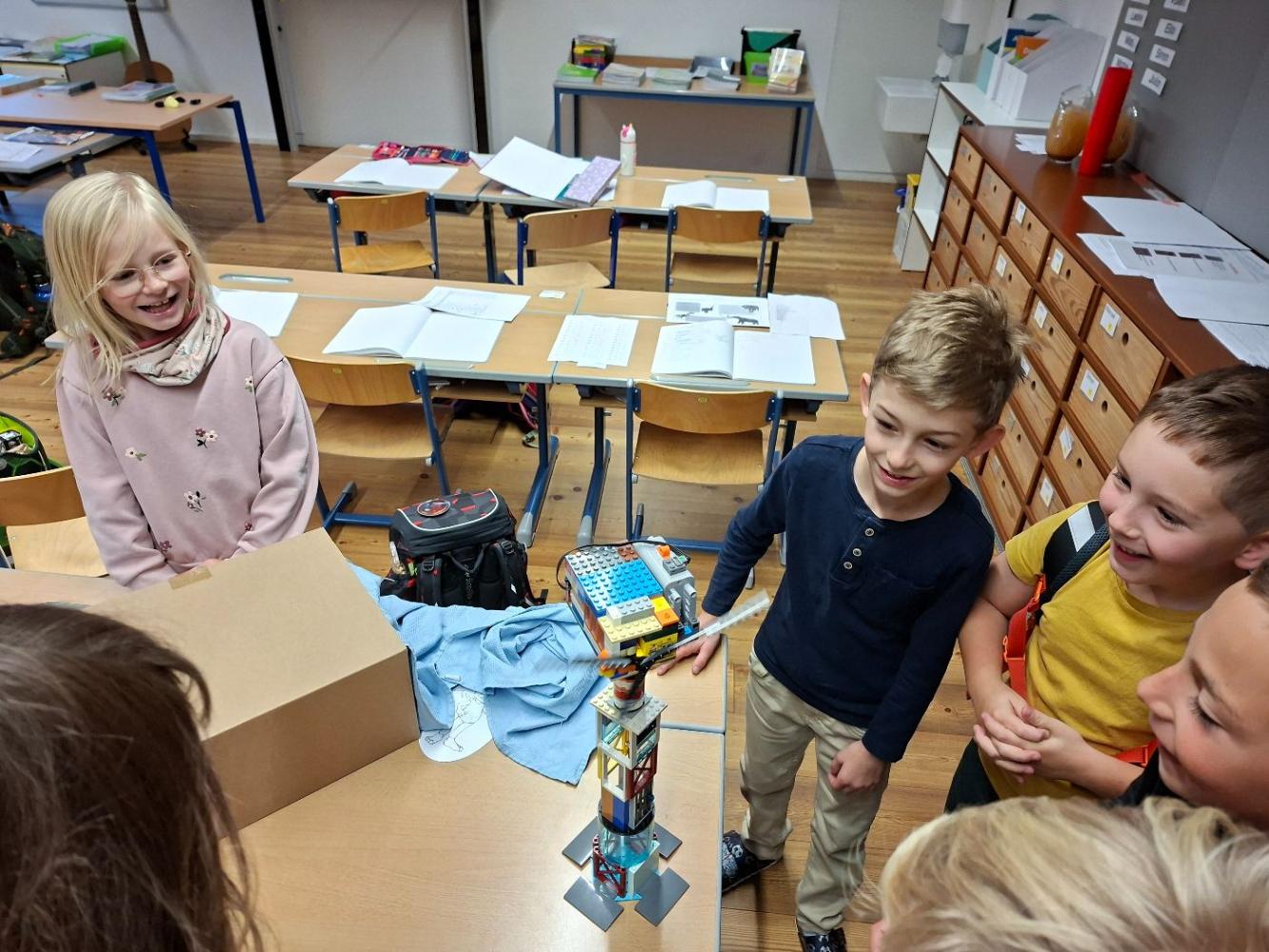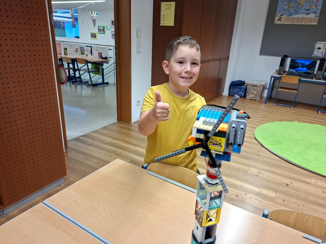Inspiriert von unserem Workshop, in dem wir viel über Windräder hörten, setzte sich Julian zu Hause gleich hin und baute ohne Anleitung aus vielen Legoteilen ein eigenes Windrad. Es hatte sogar einen eingebauten Motor und drehte sich. Mit viel Stolz brachte Julian sein Windrad mit in die Schule uns zeigte es seinen Freunden!