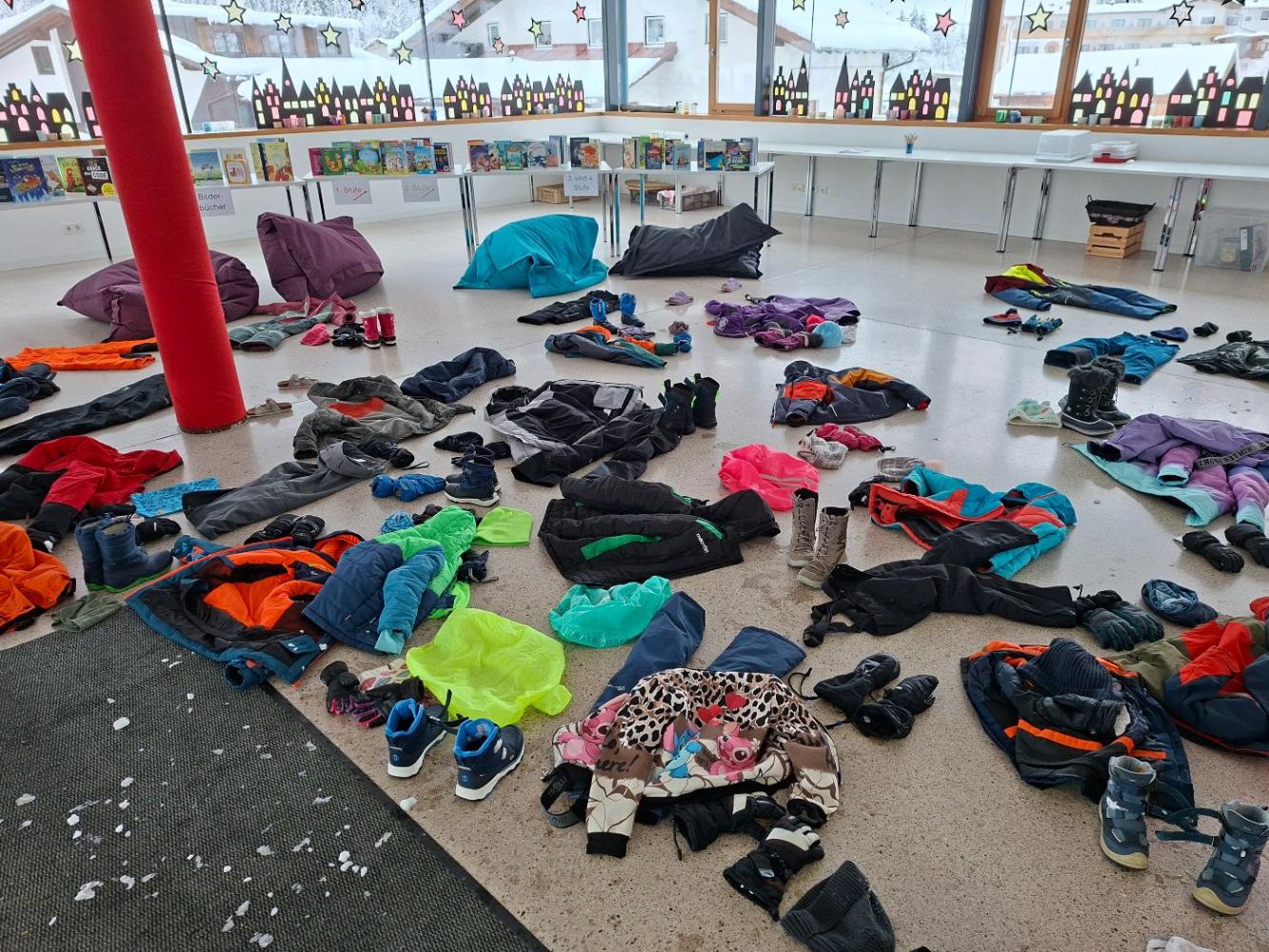 Die Schisachen werden dann in der Aula aufgelegt und dann kann alles bis zum Schulschluss wieder trocknen.