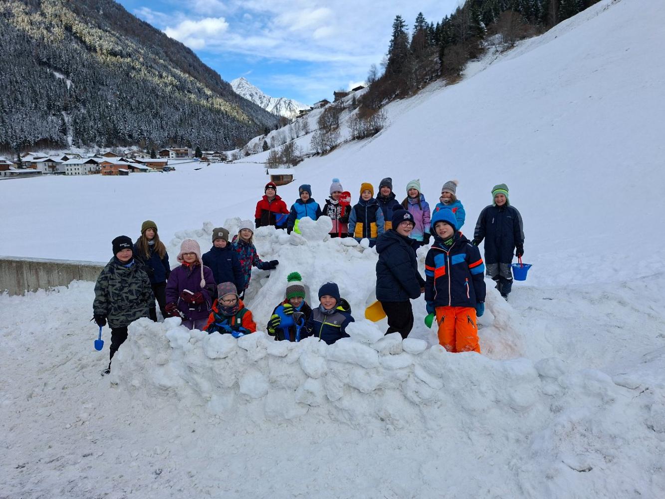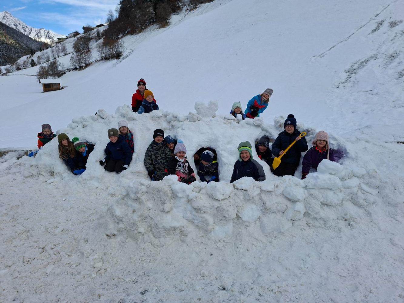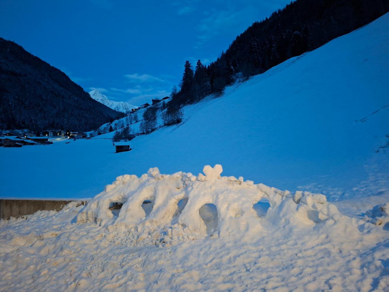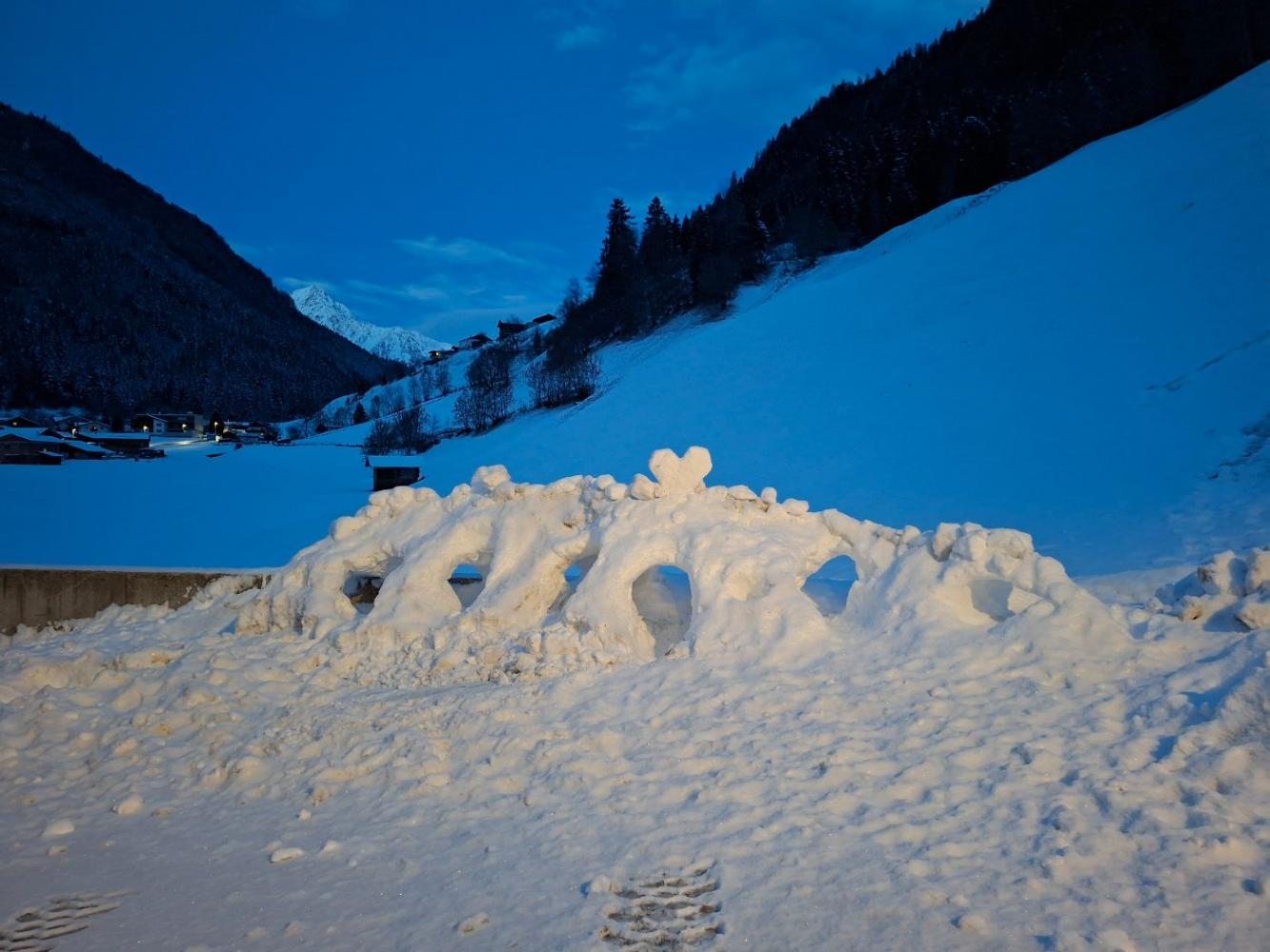 Nachdem in den letzten Wochen endlich wieder ein wenig Schnee vom Himmel fiel, hatten einige Kinder die größte Freude, bei jeder Gelgenehit draußen viele Schneehöhlen zu bauen. Es war wunderschön mit anzusehen, mit viel viel Eifer und Gemeinschaft sie etwas ganz tolles bauten. Gerade am Abend erinnerten die Höhlen an ein Dino- Skelett. Sogar die Gemeindearbeiter Johann und Dominik halfen mit, sie schoben den Schnee von der Schneeräumung immer ganz vorsichtig an die Seite und die Kinder hatten wieder neues Material.