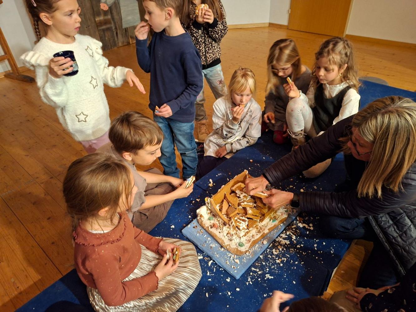 Dann durften alle endlich das lecker duftende Lebkuchenhaus zerlegen und verspeisen.
