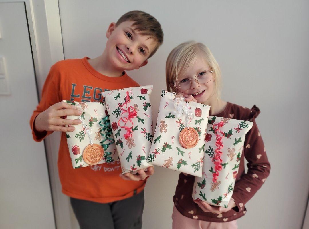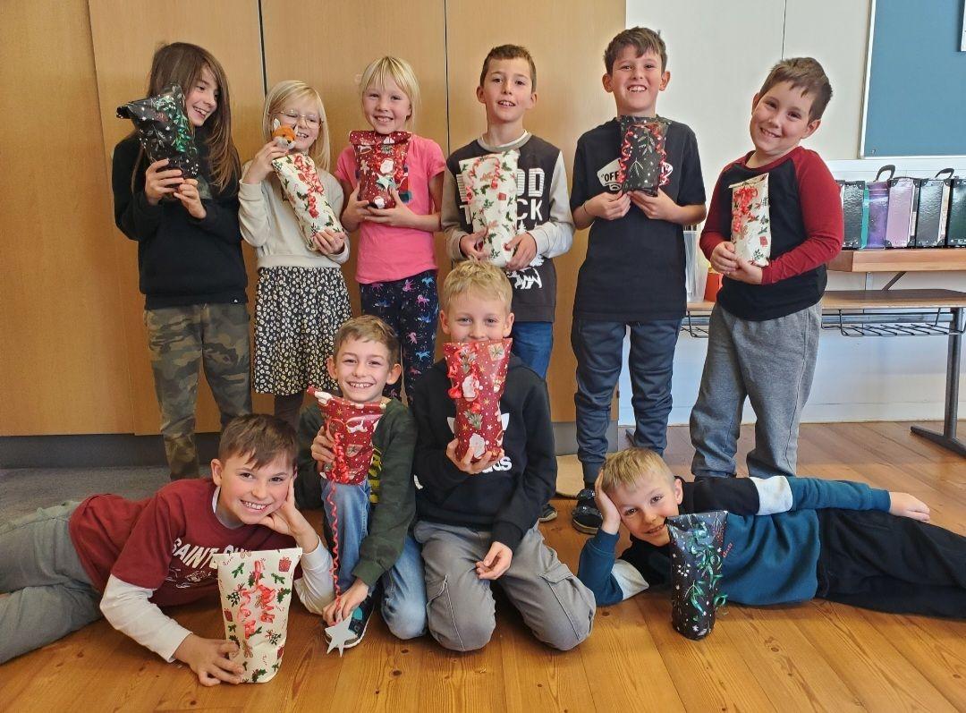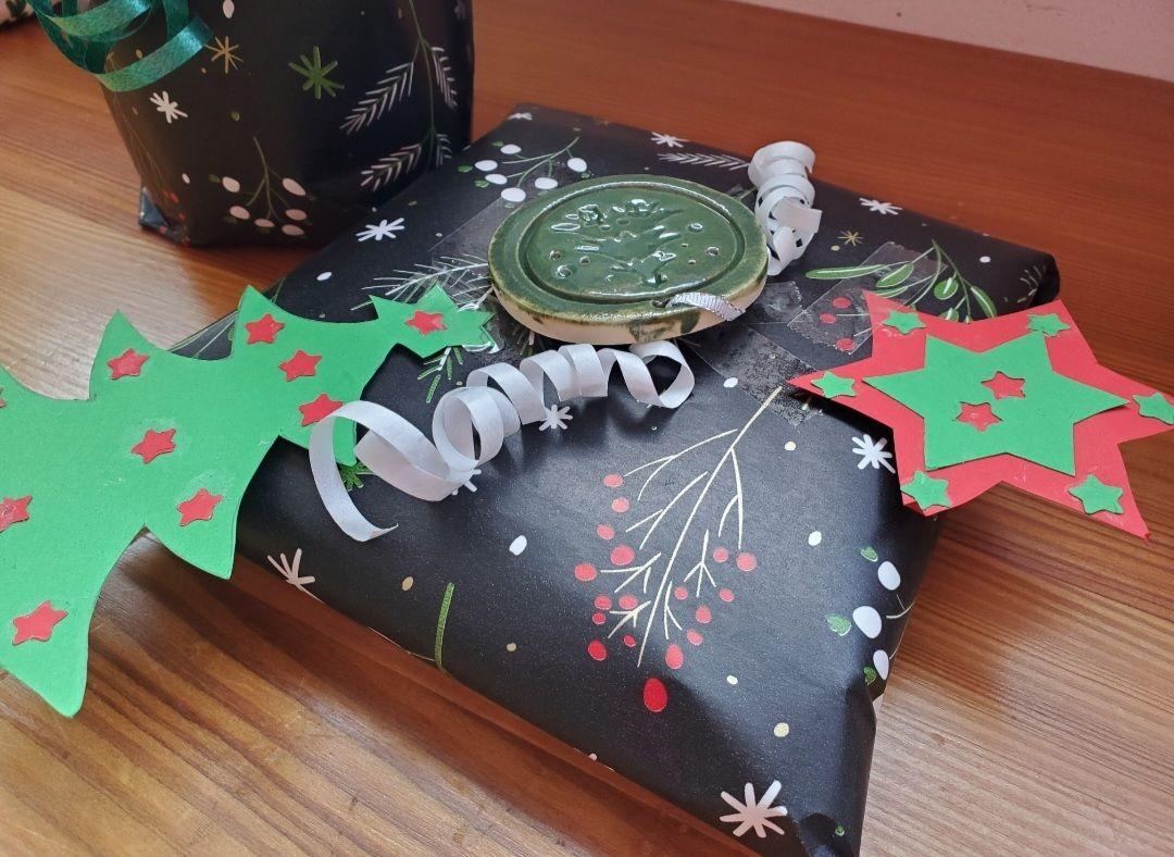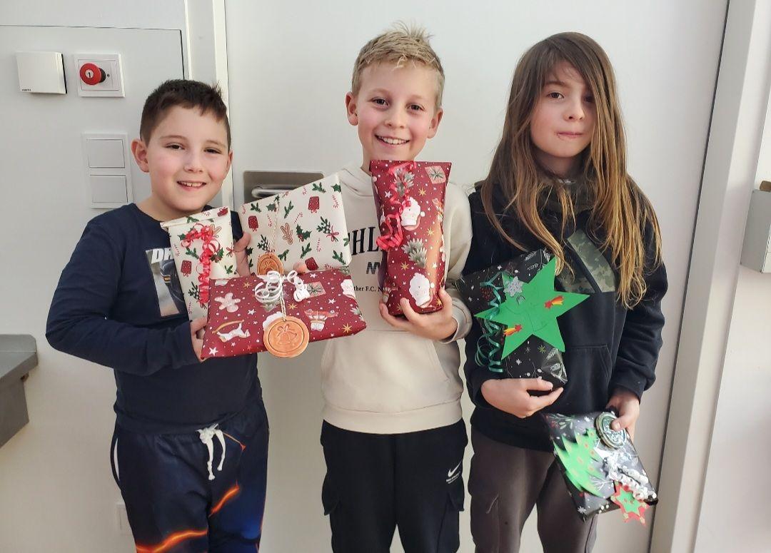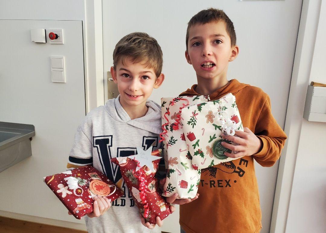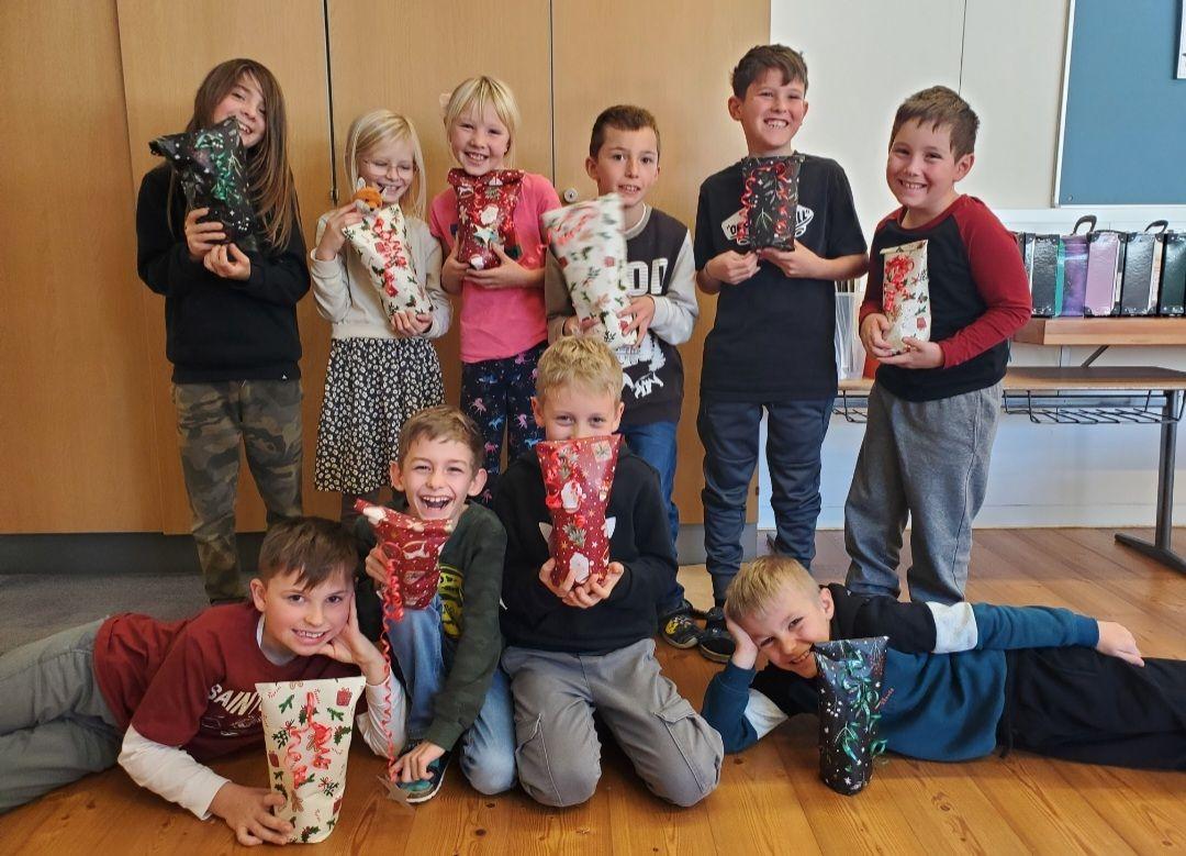 Das Verpacken geschieht immer in Partnerarbeit - da sind die Schüler/innen schon richtige Profis. Sorgfältig wurden die Sterne und Engel zuerst in Luftpolsterfolie, anschließend in Geschenkspapier verhüllt. Das Schlussfoto lässt die Freude und den Stolz unserer geschickten Bastler/innen erahnen.