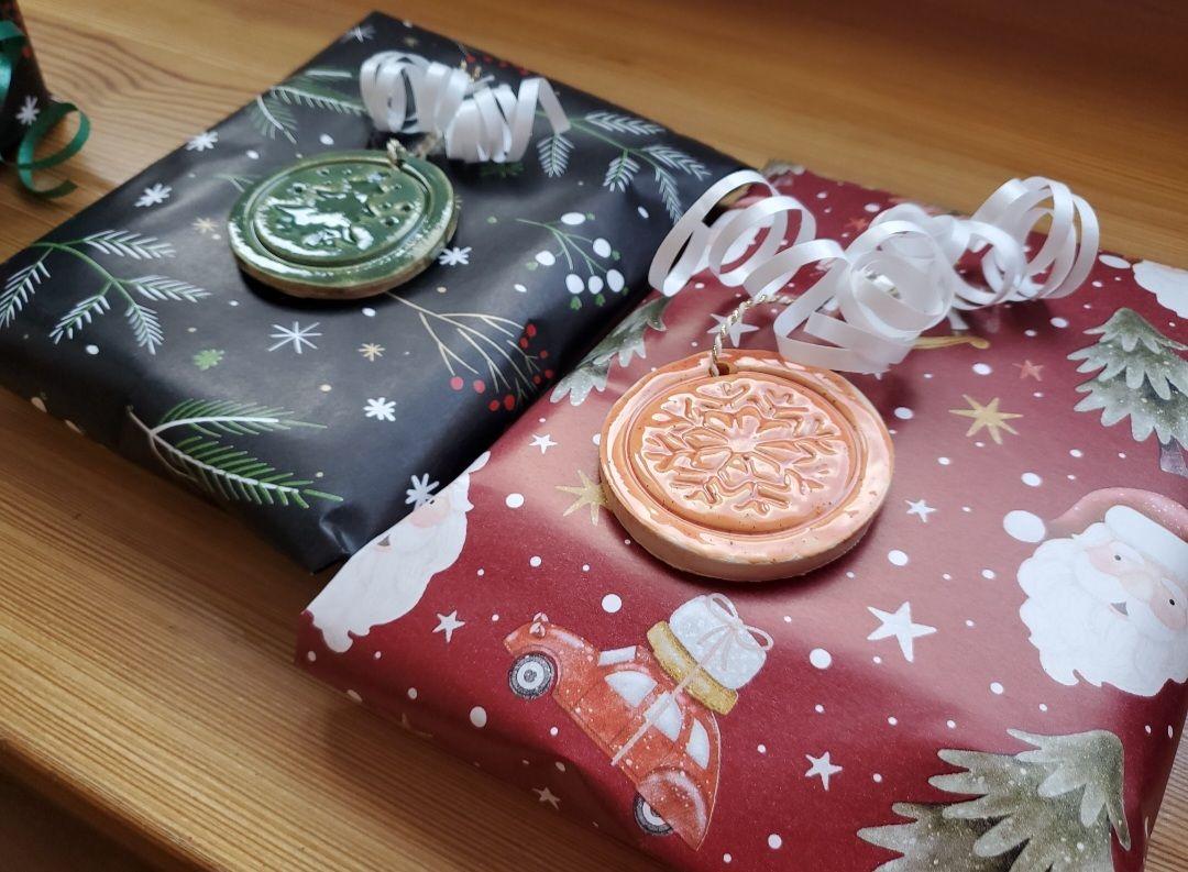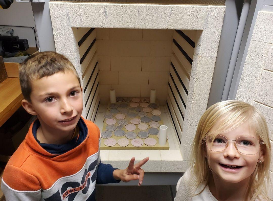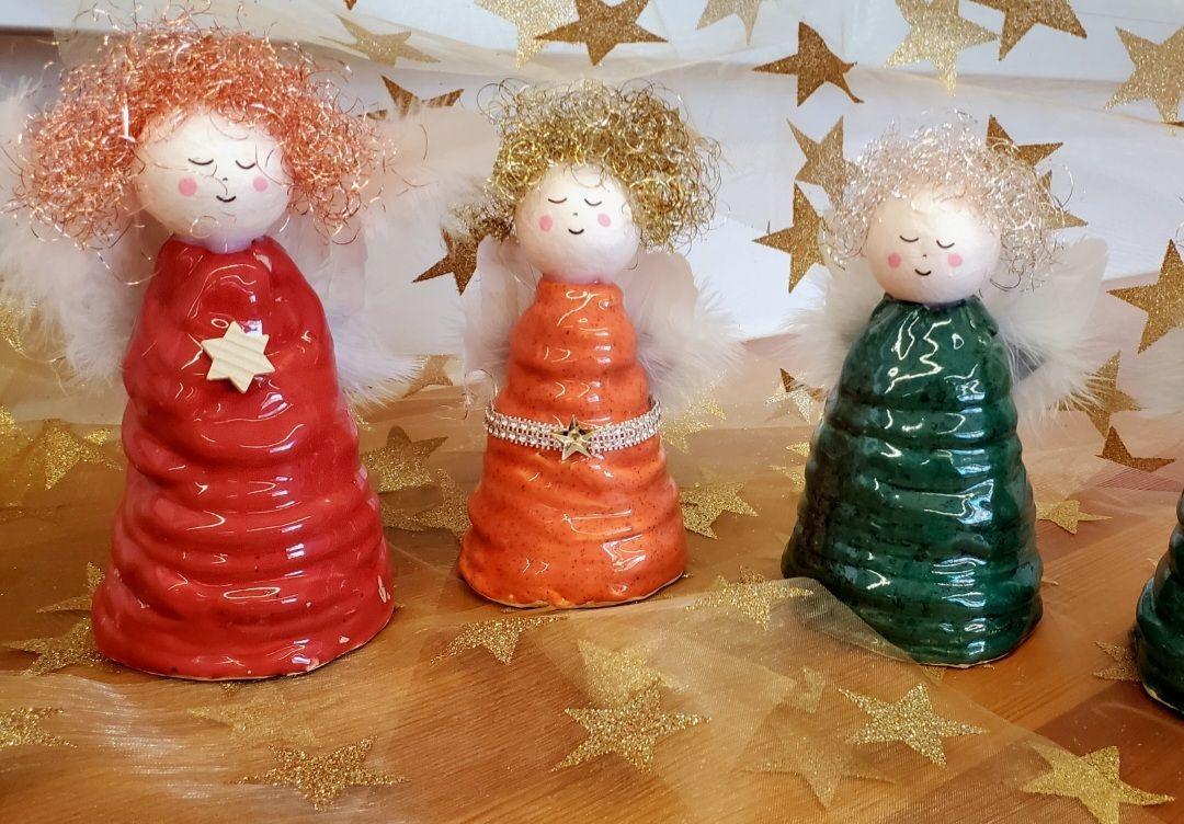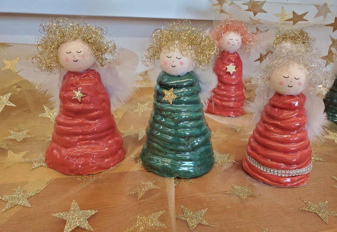 In der darauffolgenden Stunde mussten die Engel und die Anhänger glasiert werden. Alle waren sichtlich gespannt, wie das Ergebnis ausfallen würde. Die glänzenden Engelskörper, die aus dem Tonofen blitzten, sorgten eine Woche später für Begeisterung. Nun konnte den süßen Himmelsboten noch der letzte Schliff verpasst werden. Engelshaar, Silberborten und Maschen trugen zur Vollendung bei.