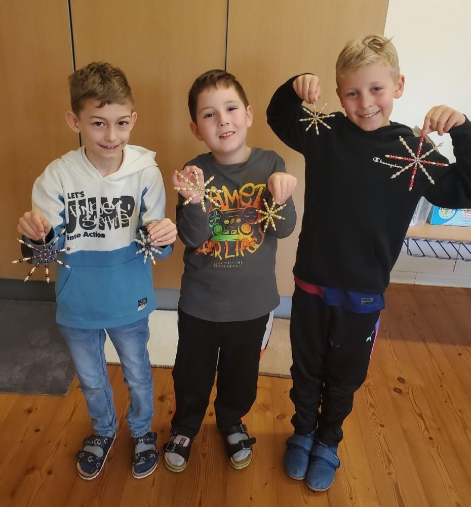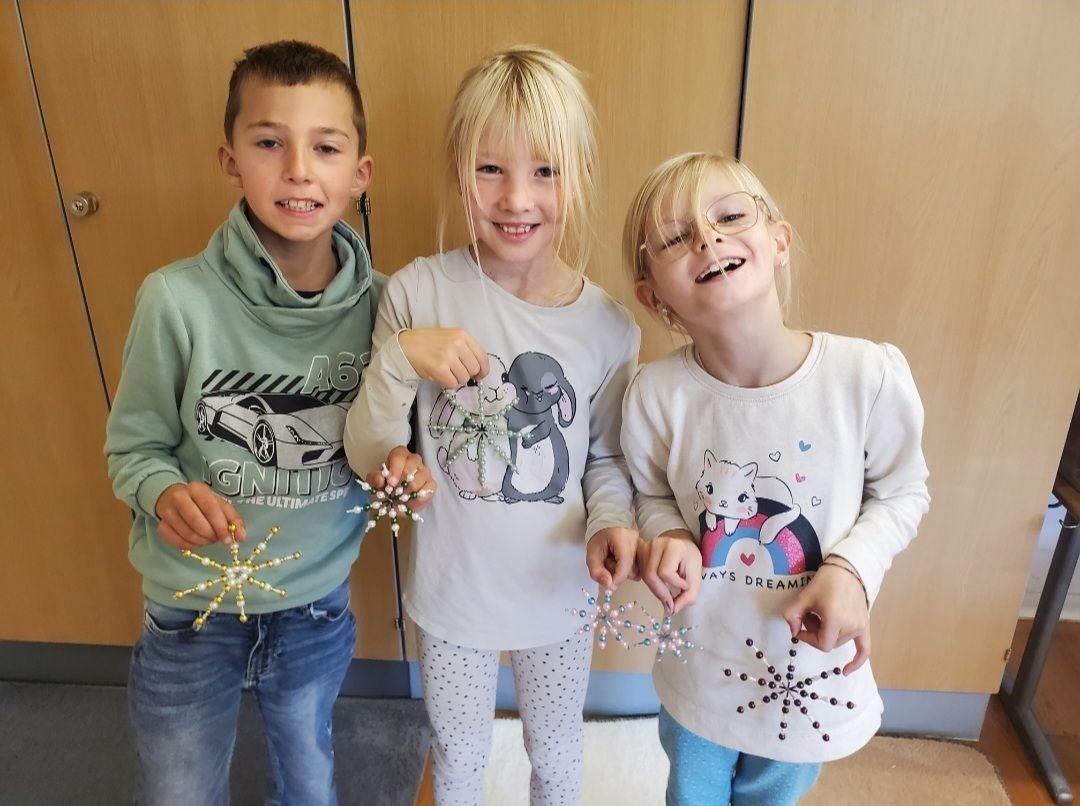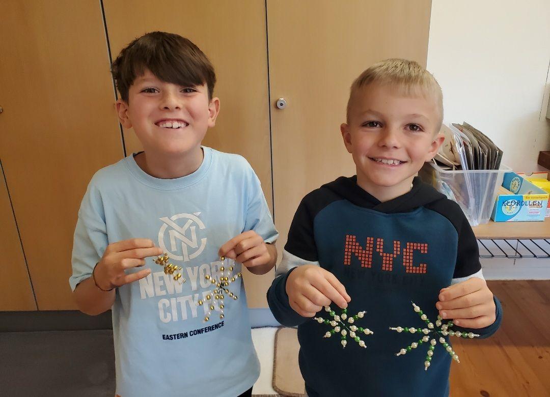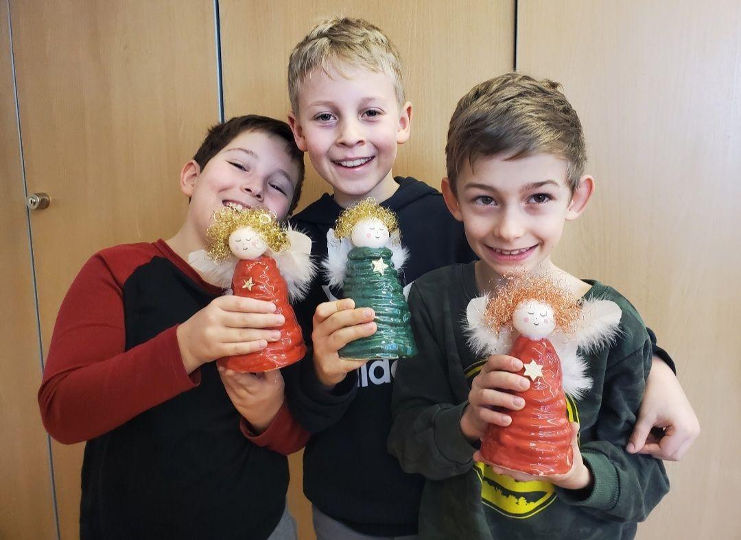 Begonnen wurde mit Weihnachtssternen - diese mussten mit viel Geduld und nach vorgegebenem Muster aufgefädelt werden. Das zweite Werkstück wurde aus Ton angefertigt. In der Wulsttechnik wurde der Körper eines Engels kegelförmig aufgebaut. Sofort bemerkten die fleißigen Modellierer/innen, dass dies einfacher aussieht als es ist. Trotzdem erledigten sie ihre Arbeit spitzenmäßig und so konnten die Grundformen trocknen und später im Tonofen gebrannt werden. Aus den Tonresten kreierten die Kinder wunderschöne Geschenkanhänger.