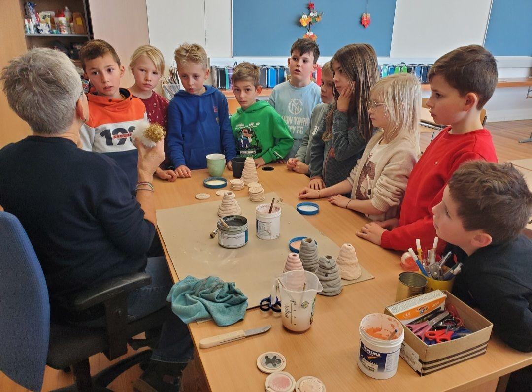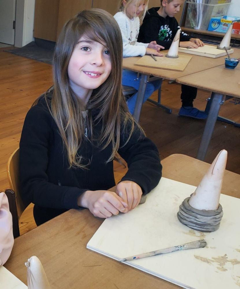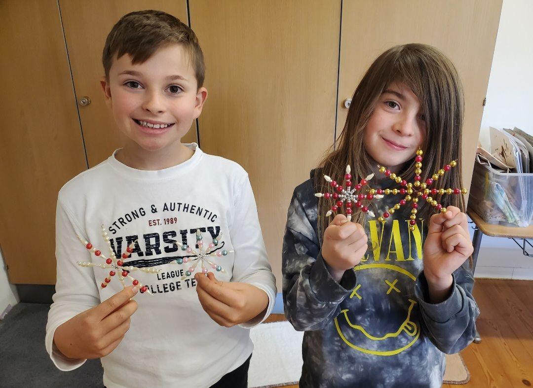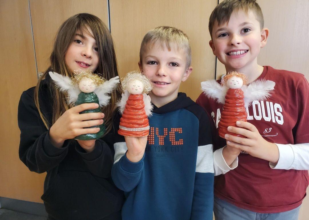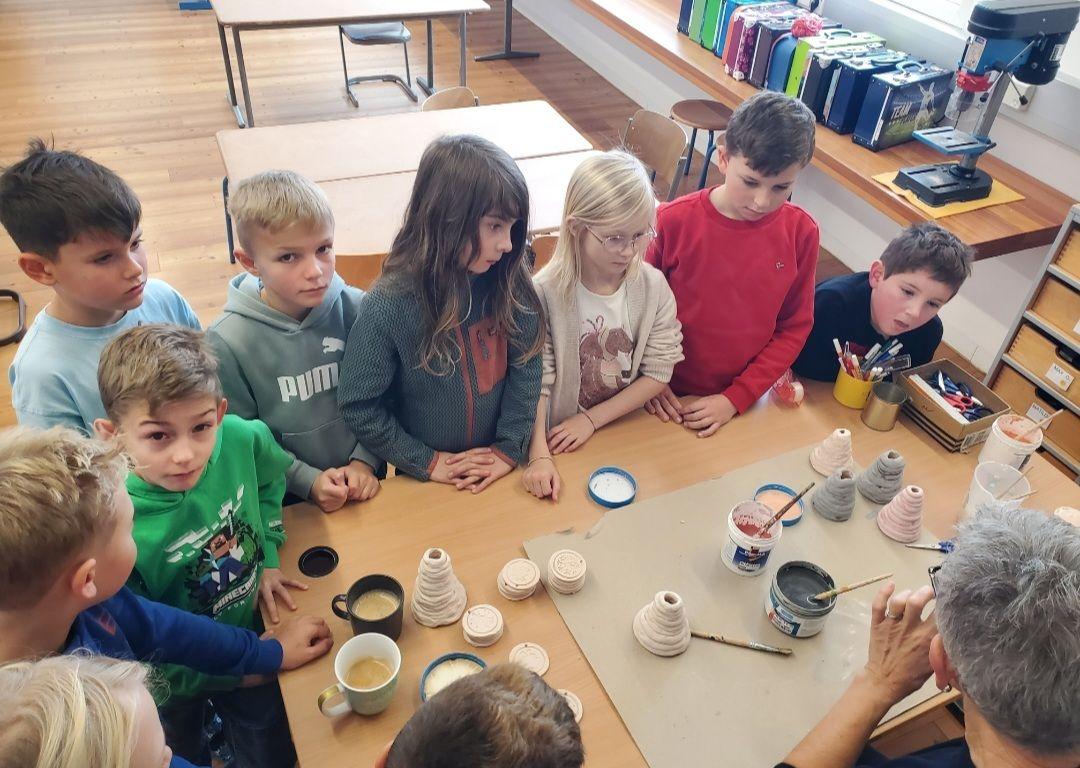 Begonnen wurde mit Weihnachtssternen - diese mussten mit viel Geduld und nach vorgegebenem Muster aufgefädelt werden. Das zweite Werkstück wurde aus Ton angefertigt. In der Wulsttechnik wurde der Körper eines Engels kegelförmig aufgebaut. Sofort bemerkten die fleißigen Modellierer/innen, dass dies einfacher aussieht als es ist. Trotzdem erledigten sie ihre Arbeit spitzenmäßig und so konnten die Grundformen trocknen und später im Tonofen gebrannt werden. Aus den Tonresten kreierten die Kinder wunderschöne Geschenkanhänger.