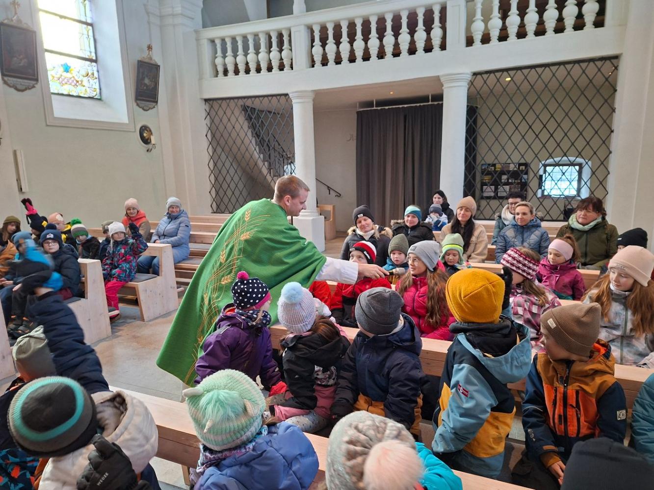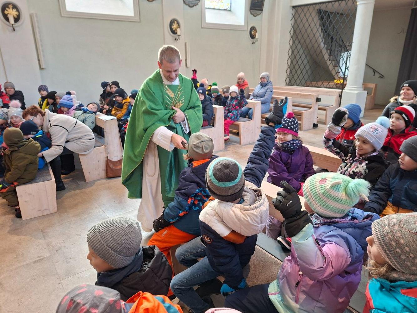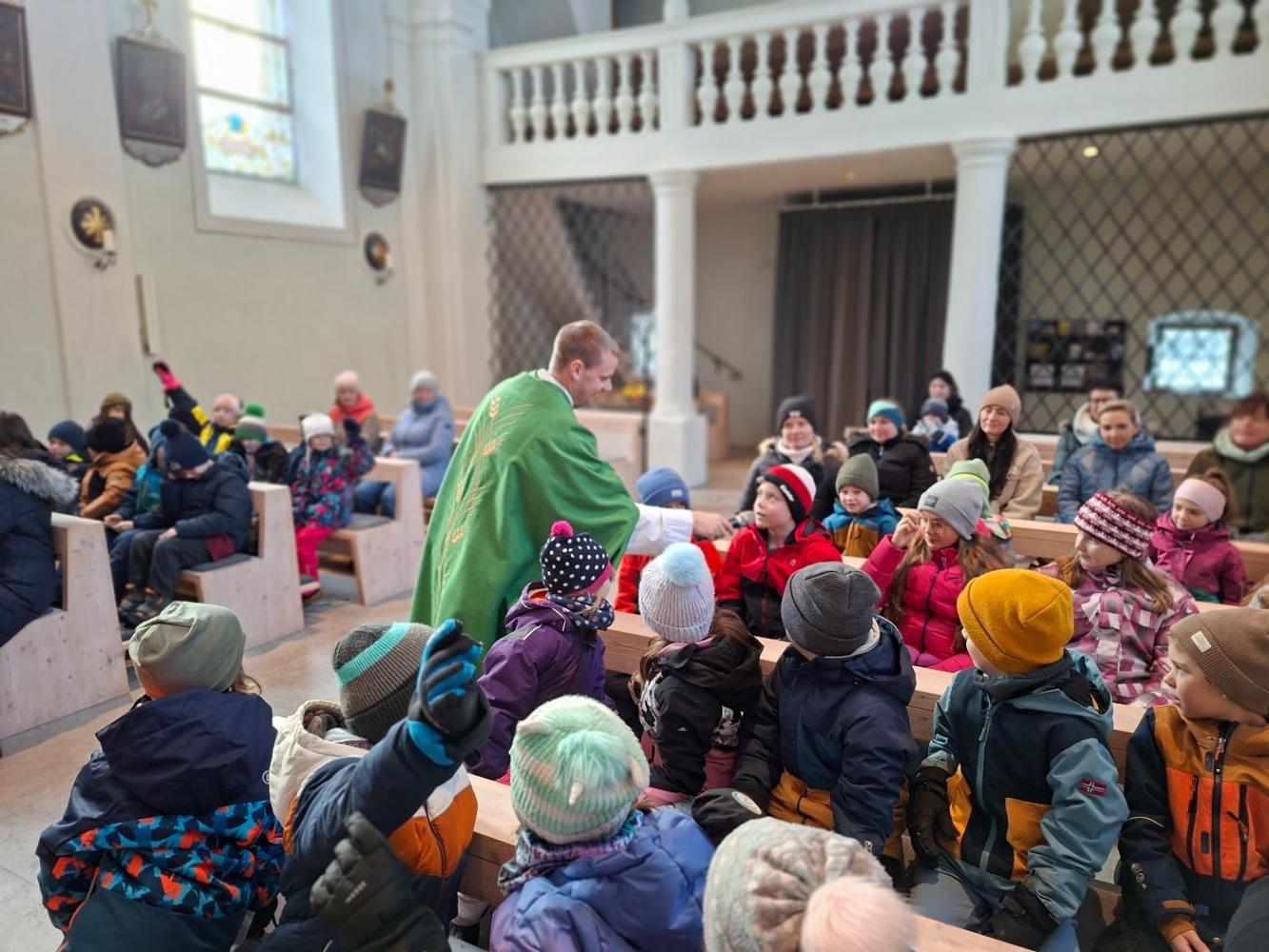 Gemeinsam mit den Kindern vom Kindergarten feierten wir eine nette Messe in der doch sehr kühlen Kirche. Mit Liedern und Geschichten erzählte uns Leopold von Jesus und seinem Wirken. Bei dieser Messe erfuhren die Kinder, dass Jesus bei der Hochzeit in Kana aus Wasser Wein verwandelte. Das war sein erstes Wunder. Besonders warm wurde es allen, als die Kinder Beispiele sagten, wann es ihnen gut geht: Wenn mein Papa von der Arbeit heim kommt, wenn man mich umarmt, ... waren nur ein paar Wortmeldungen.
