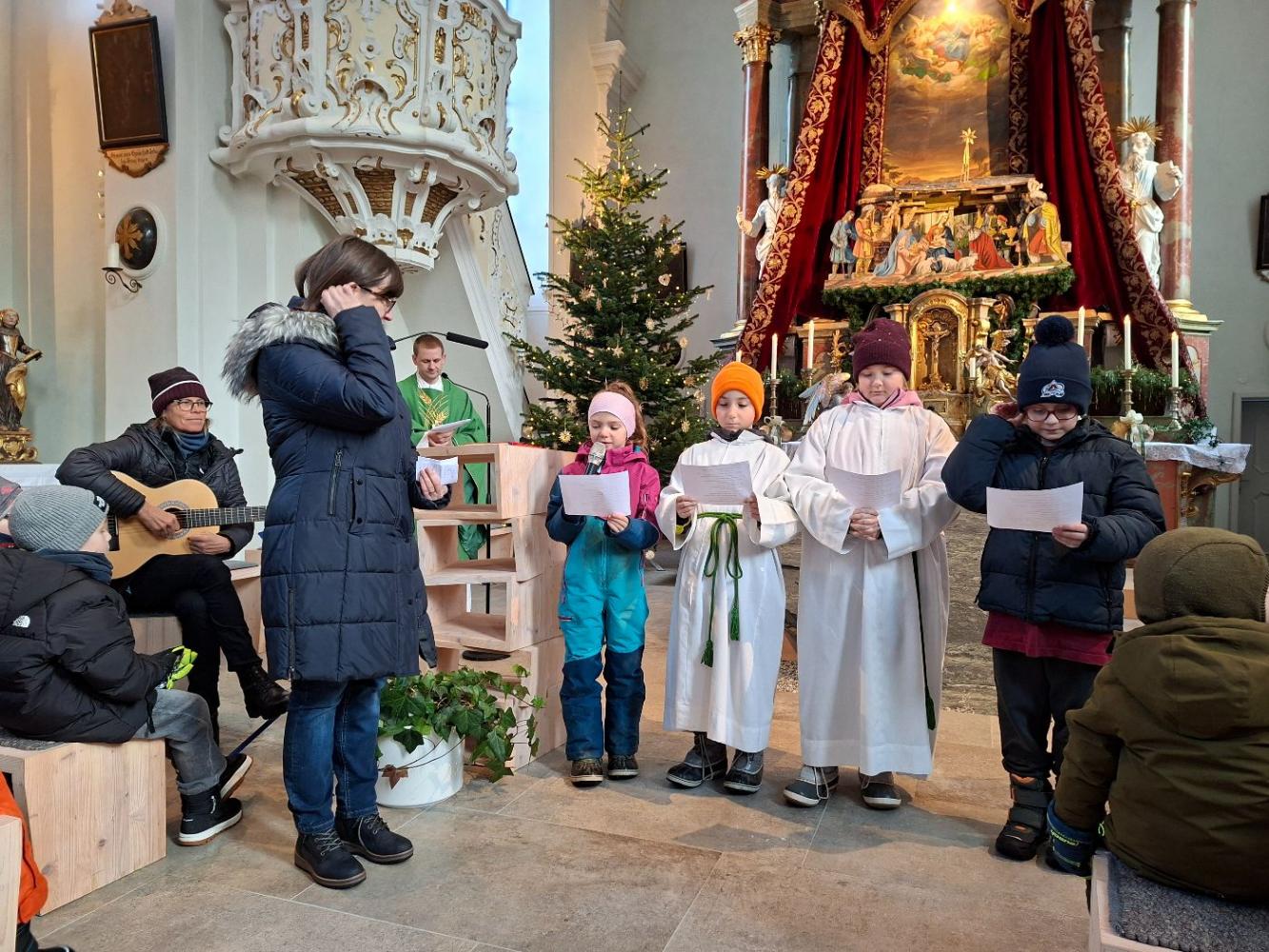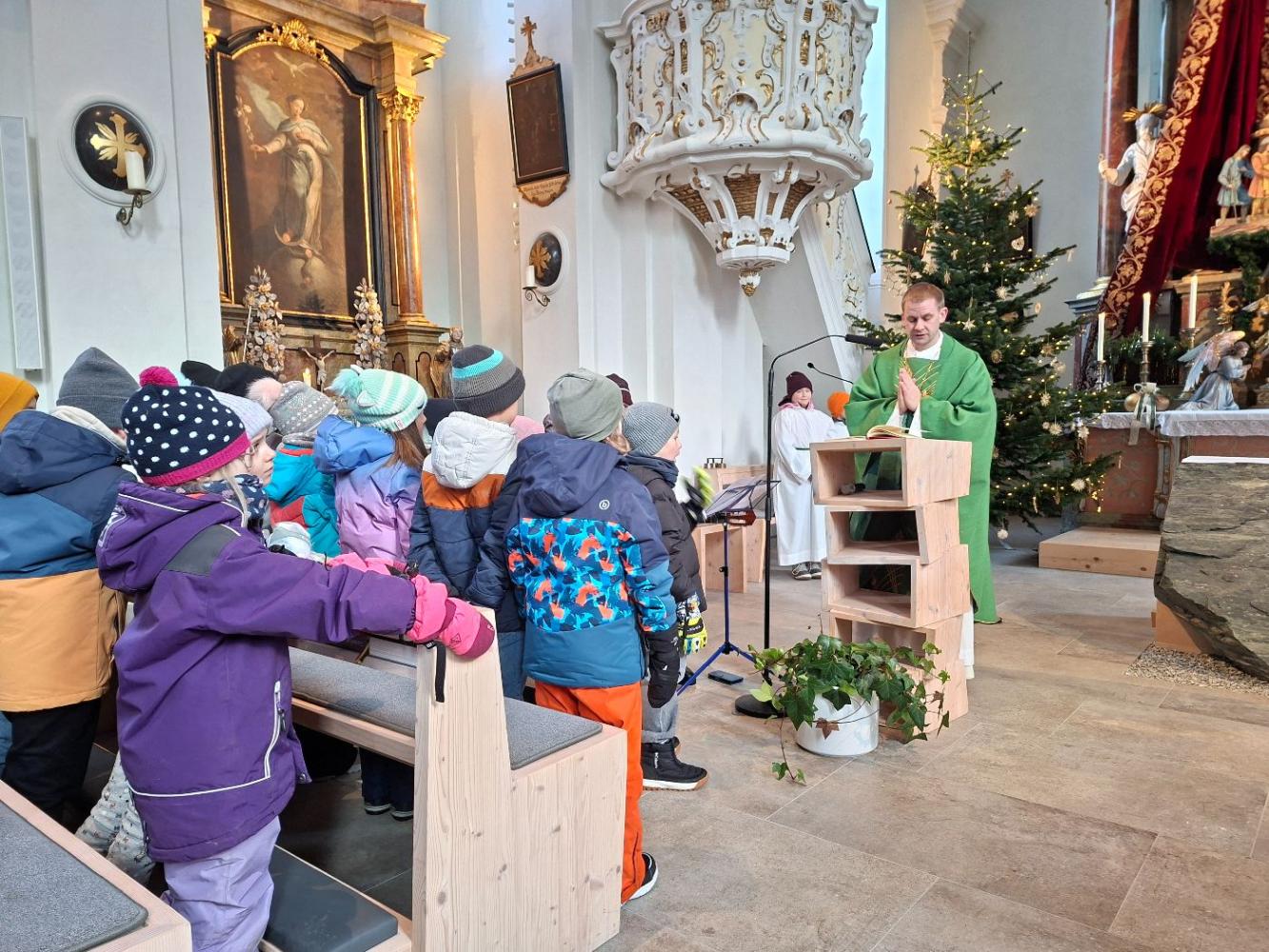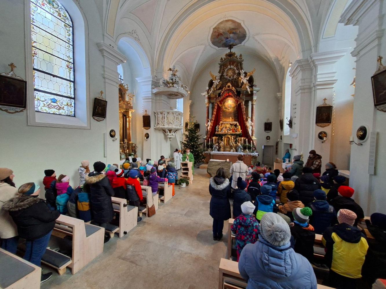 Gemeinsam mit den Kindern vom Kindergarten feierten wir eine nette Messe in der doch sehr kühlen Kirche. Mit Liedern und Geschichten erzählte uns Leopold von Jesus und seinem Wirken. Bei dieser Messe erfuhren die Kinder, dass Jesus bei der Hochzeit in Kana aus Wasser Wein verwandelte. Das war sein erstes Wunder. Besonders warm wurde es allen, als die Kinder Beispiele sagten, wann es ihnen gut geht: Wenn mein Papa von der Arbeit heim kommt, wenn man mich umarmt, ... waren nur ein paar Wortmeldungen.